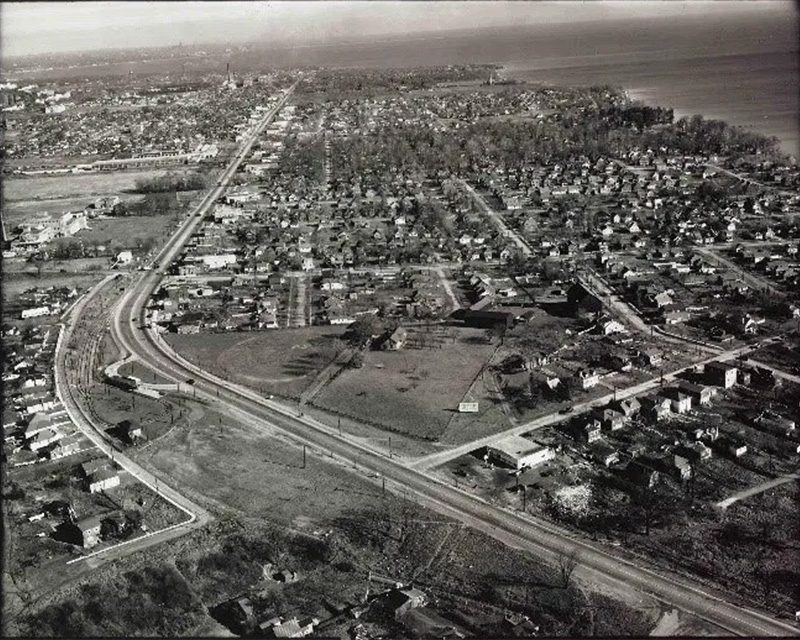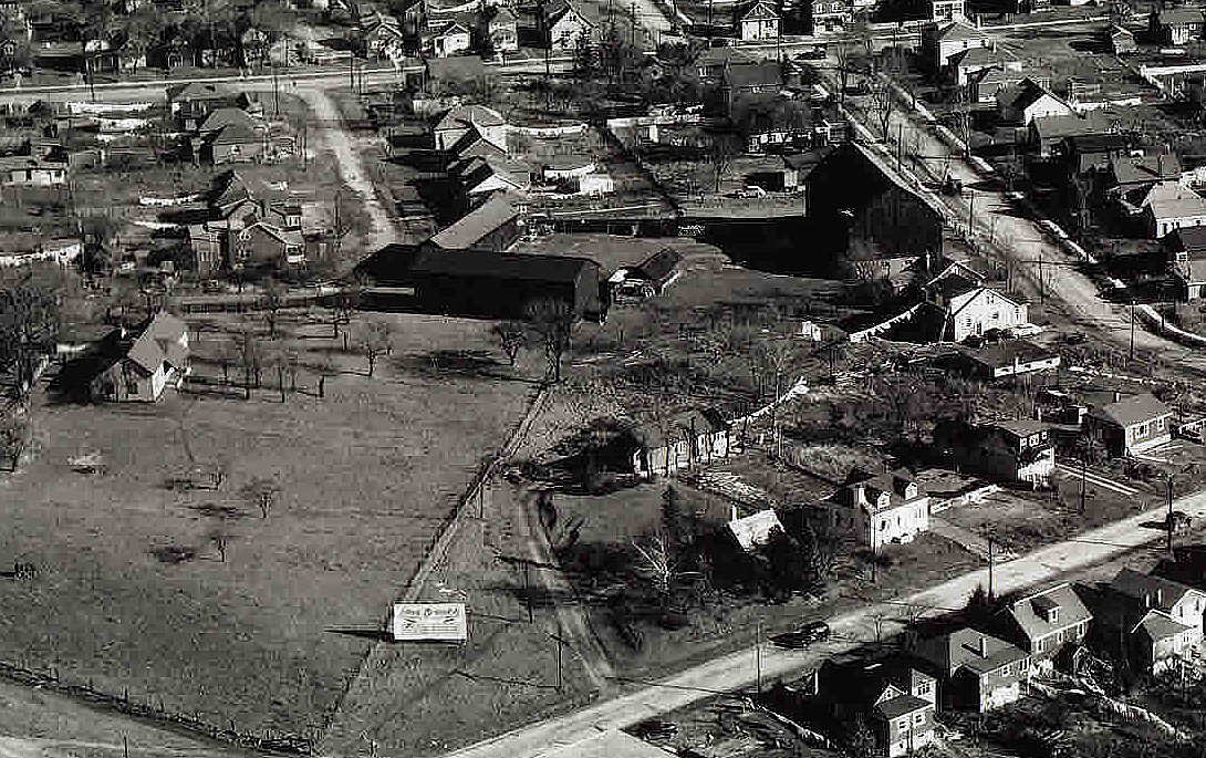 Aerial view (Nov., 1949) looking east along Lake Shore Blvd West from near Long Branch Loop, Ontario Archives Acc 16215, ES1-814, Northway Gestalt Collection. The photo shows the Colonel Samuel Smith house at Forty First St. and Lake Shore Blvd. West, originally a log cabin built in 1797, to which extensions and siding were added over the years.